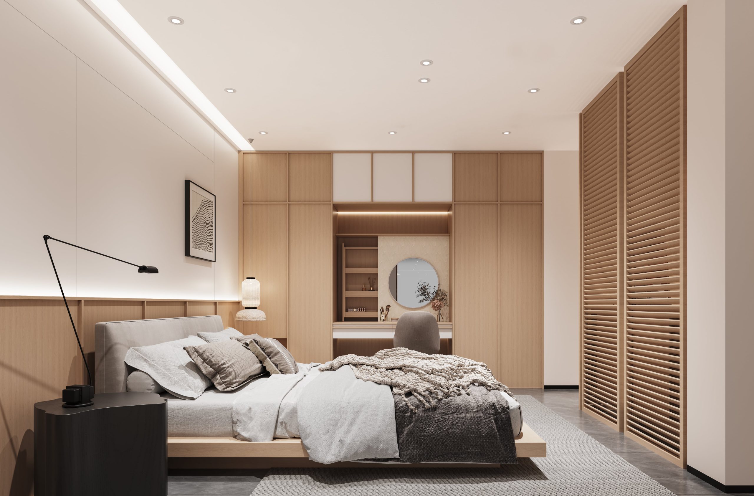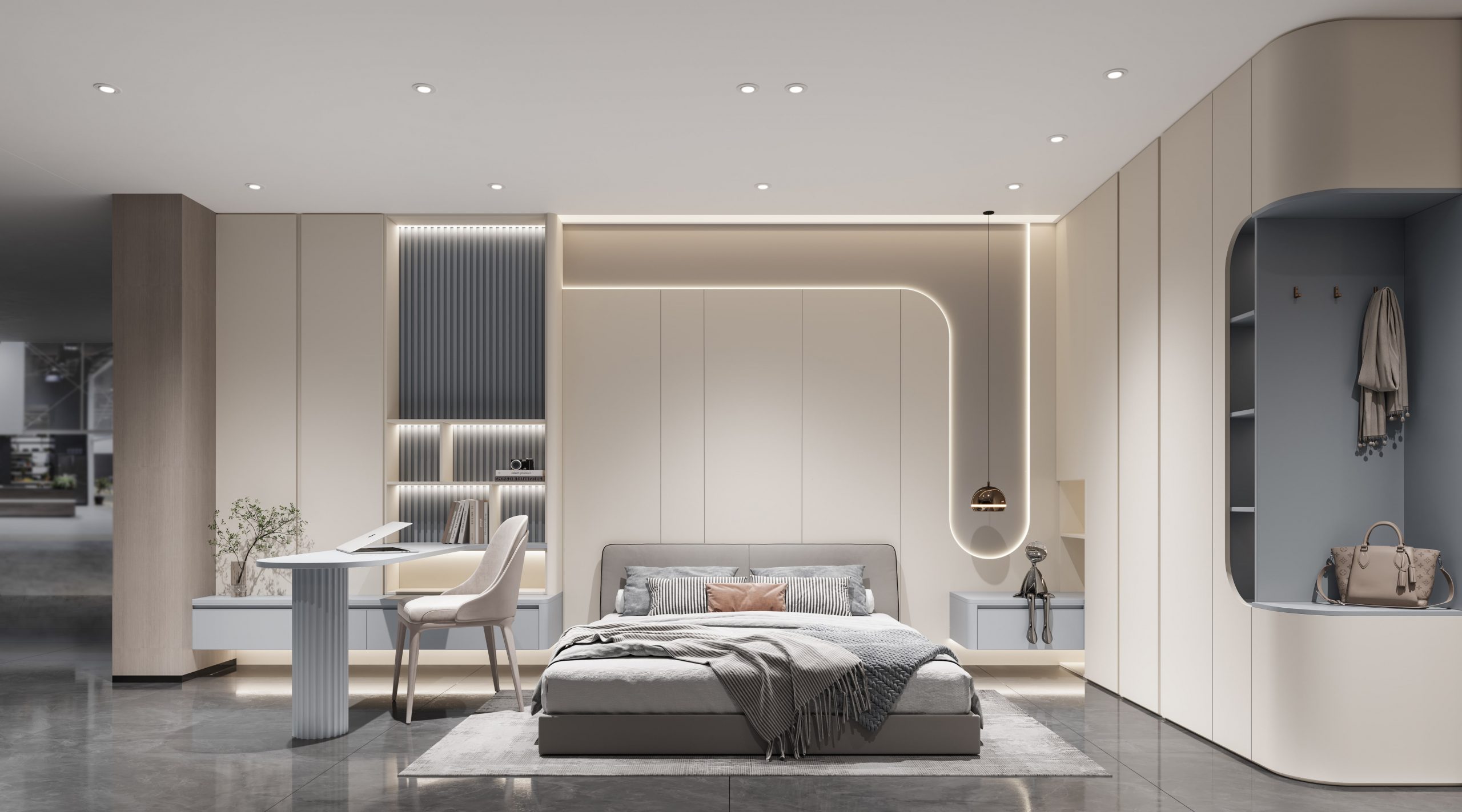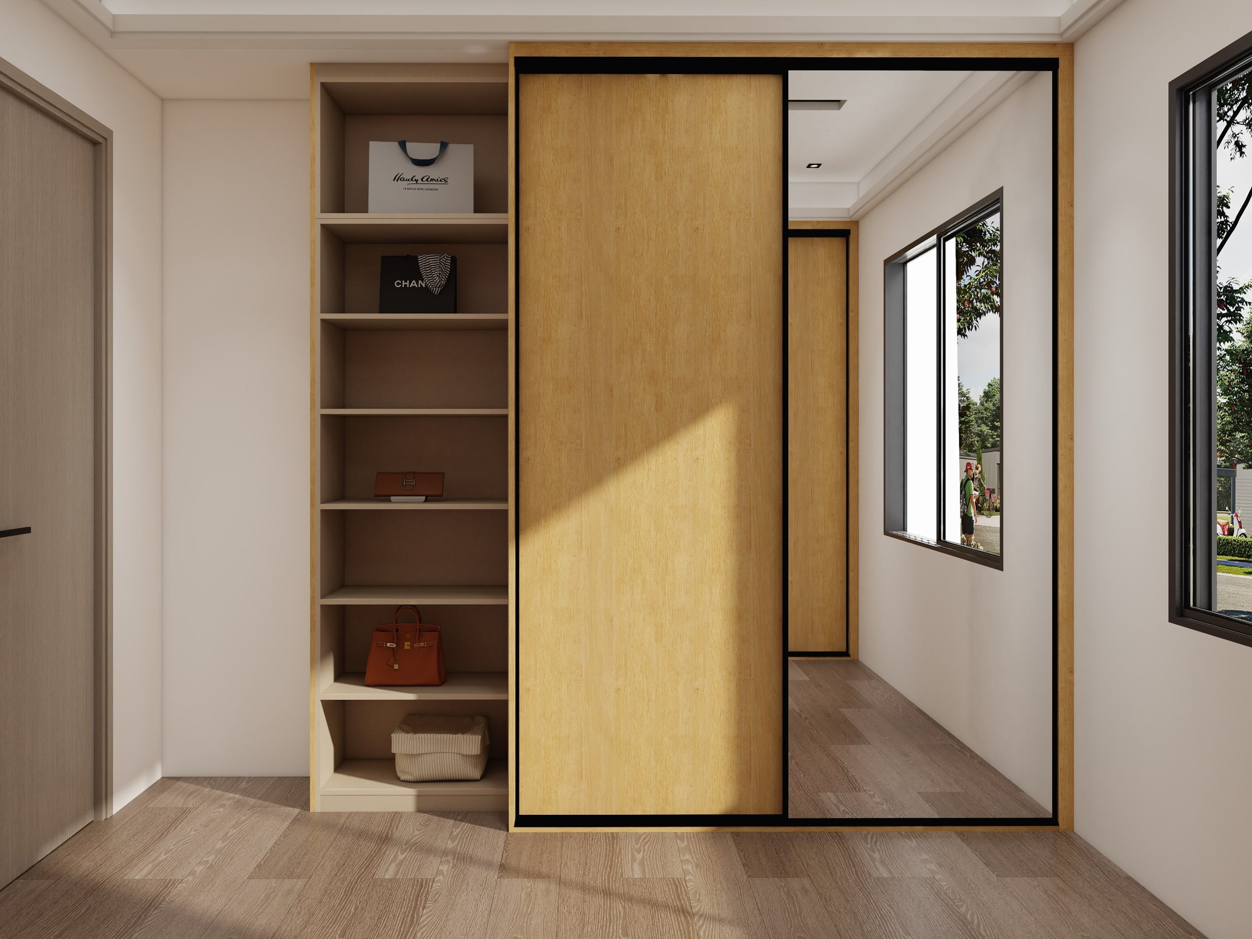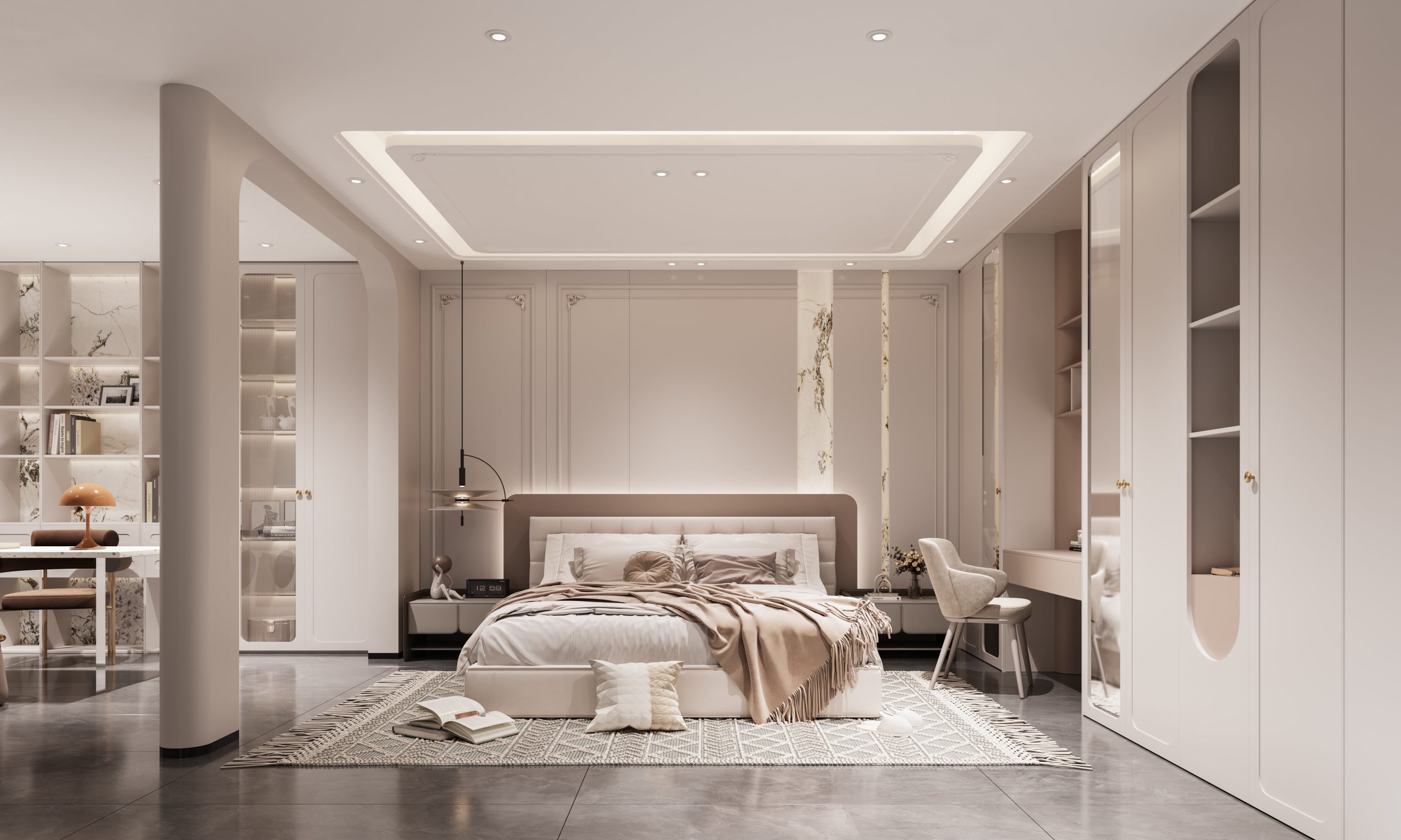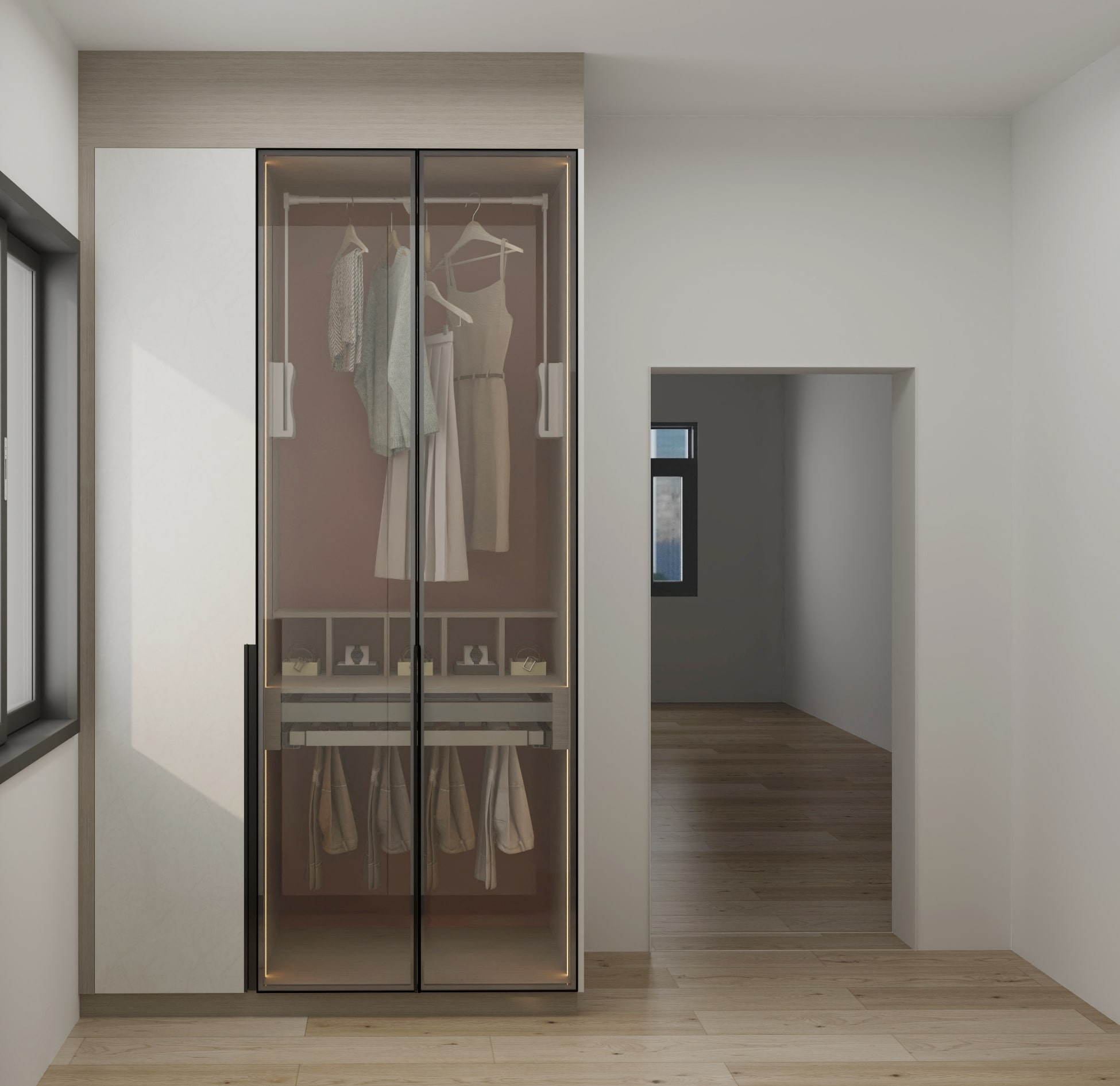 Maximize your bedroom space with an open-style wardrobe, designed for easy access and a spacious feel. Combine it with a custom bedroom wardrobe to enhance storage and functionality while maintaining a modern aesthetic.