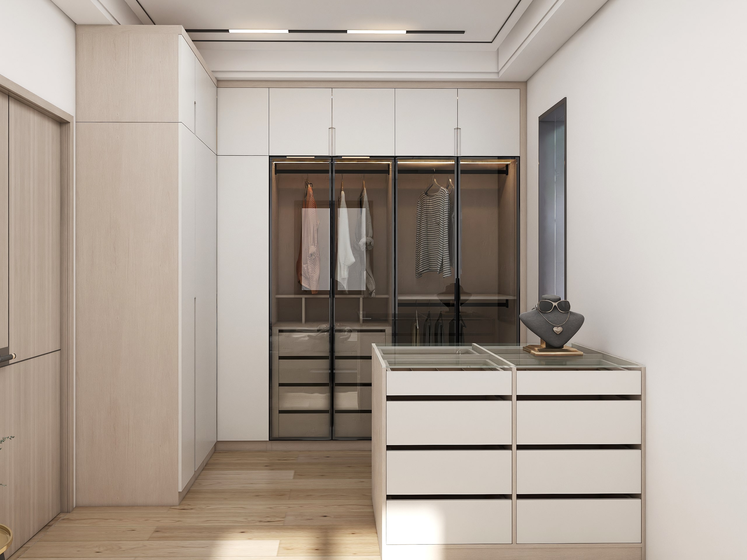 A walk-in closet is a stylish, room-like storage area that offers easy access to clothes, shoes, and accessories. With open shelves, hanging rods, and drawers, it keeps everything organized and easy to find. This layout enhances the dressing experience while adding both elegance and convenience to any home.