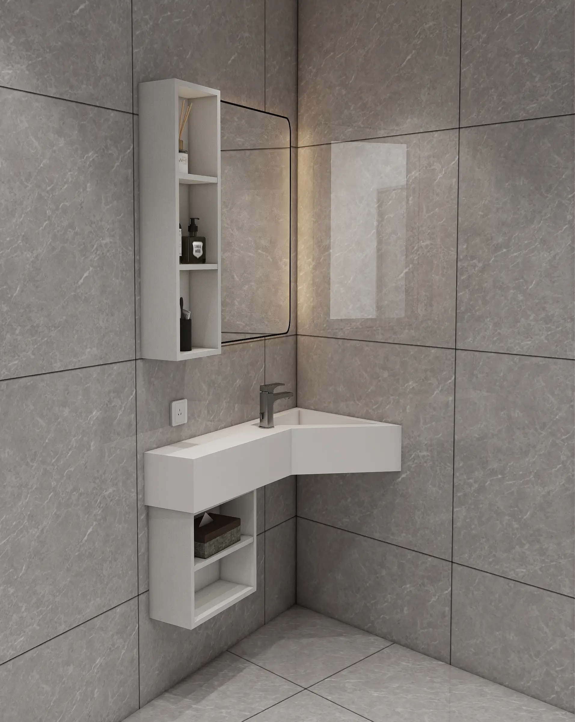Maximize your bathroom space with a corner vanity, designed to fit perfectly in corners with integrated countertops and clever lighting. Combine it with a bathroom mirror cabinet to boost storage and functionality.
